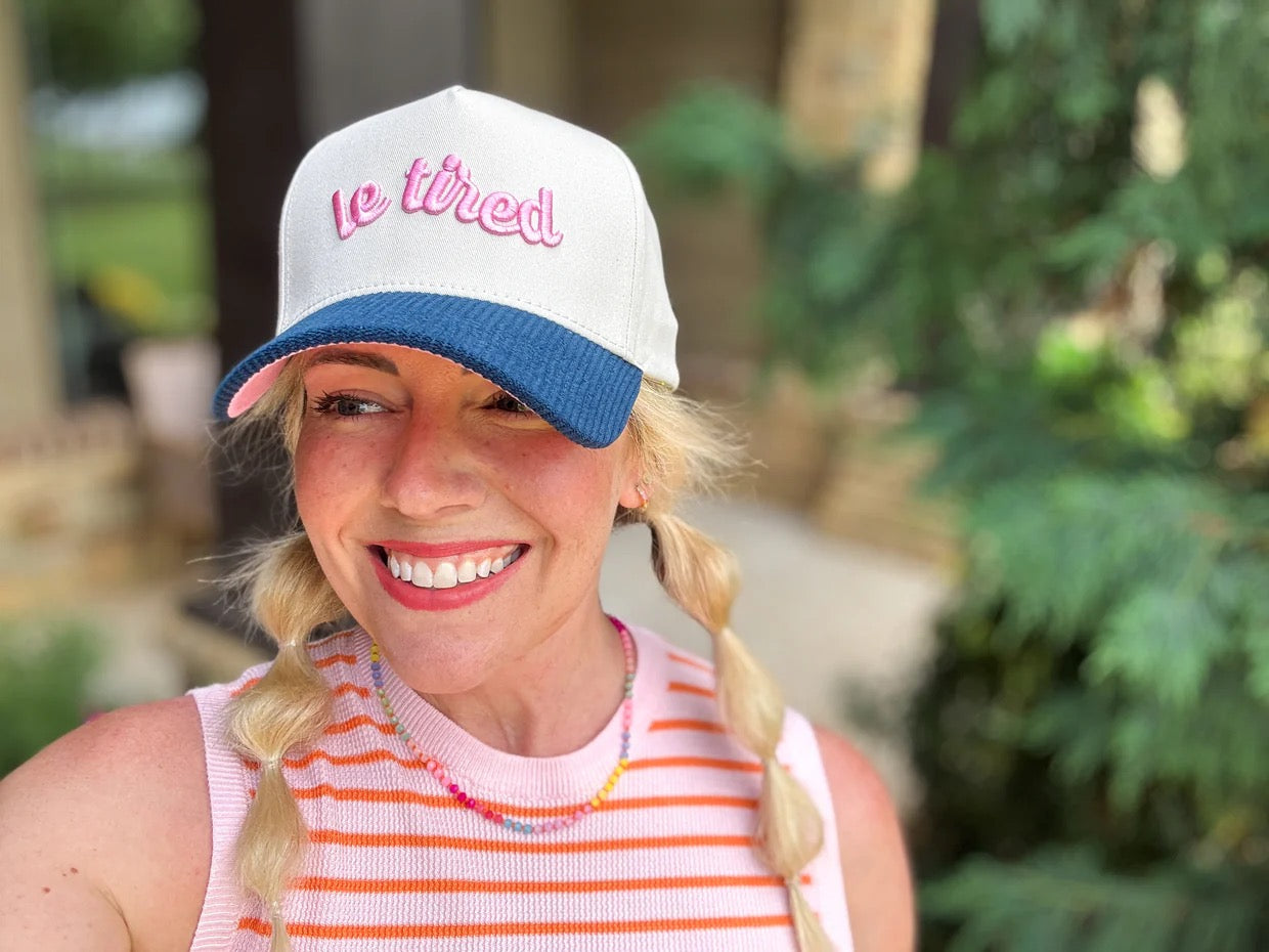 Add a splash of fun to your customers fall and winter wardrobe with the Le Tired Baseball Hat. Featuring a cozy navy corduroy brim and charming pink embroidered details, this hat blends comfort and style effortlessly. Perfect for chilly days, it will be their new go-to accessory to keep things playful and warm.