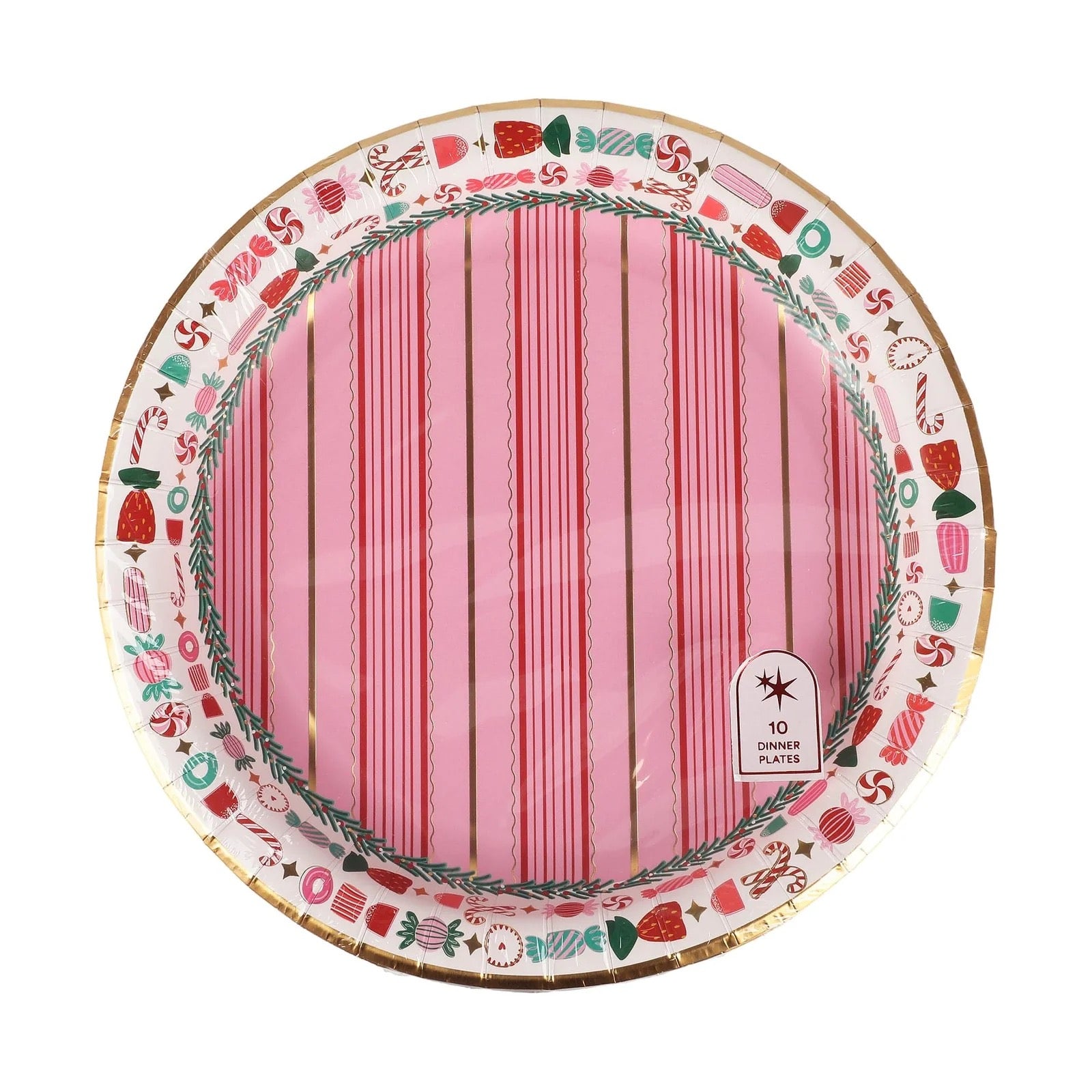 This delightful dinner plate brings a festive twist to your holiday table! Featuring a bold pink center with red vertical stripes, the plate is framed by a candy-covered border filled with peppermints, gumdrops, and sweet treats in red, green, and pink. A touch of gold detailing adds extra cheer, making it perfect for Christmas dinners, cookie parties, or any merry celebration.