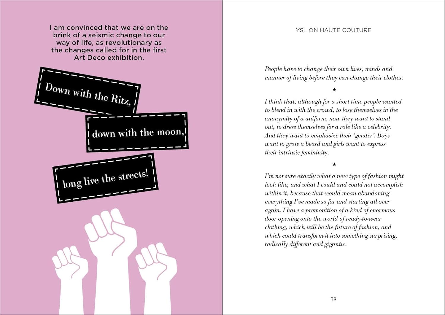 Legendary designer Yves Saint Laurent’s maxims on haute couture, women, style, and elegance, presented in an attractive gift format.